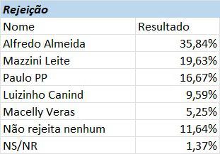 Rejeição dos Candidatos- Quando analisada a rejeição dos candidatos, Macelly Veras se destaca positivamente com o menor índice de rejeição, apenas 5,25%. Em contrapartida, Alfredo Almeida lidera a rejeição com 35,84%, seguido por Mazzini Leite com 19,63% e Paulo PP com 16,67%. Essa baixa rejeição de Macelly Veras indica uma aceitação maior entre os eleitores, refletindo uma imagem de confiança e respeito na comunidade.