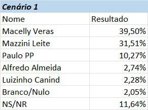 No primeiro cenário, que é estimulado, Macelly Veras obtém 39,50% das intenções de voto, superando o segundo colocado, que possui 31,51%. O terceiro colocado aparece com 10,27%, enquanto os demais candidatos apresentam percentuais abaixo de 3%. Essa vantagem demonstra a confiança dos eleitores na proposta e na trajetória política de Macelly.